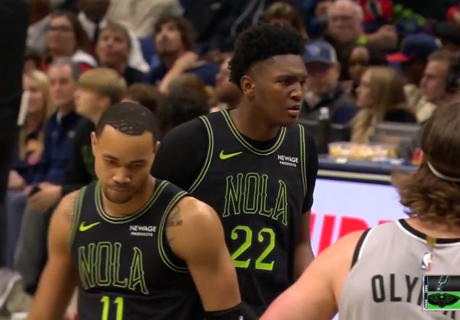 首节开打,琼斯抢断卡斯尔后,反击快下轻松上篮得手,拿到复出后首分,鹈鹕队先拔头筹。卡斯尔持球突破,放缓脚步控制节奏对抗上篮打进,立马还以颜色。随后两队进入多达3分钟的打铁大战,一分未得,琼斯突破抛投命中,终于打破两队得分荒。菲尔斯和巴恩斯互飙三分,尚帕尼三分偏出,凯尔登杀到篮下在对手背后强行完成补篮马刺领先到6分。阿尔瓦拉多三分强投命中后,又利用挡拆突破,助飞马特科维奇完成空接双手暴扣,鹈鹕将分差缩小至3分。尚帕尼连续命中两记三分,福克斯迎着防守强投三分压哨再中,首节打完,马刺35-25领先鹈鹕10分。