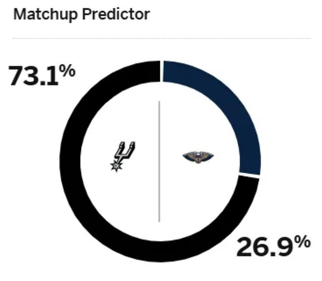 赛前,美媒ESPN预测本场比赛的实时胜率,鹈鹕胜率仅有26.9%,马刺队胜率则高达73.1%,差距非常明显。
